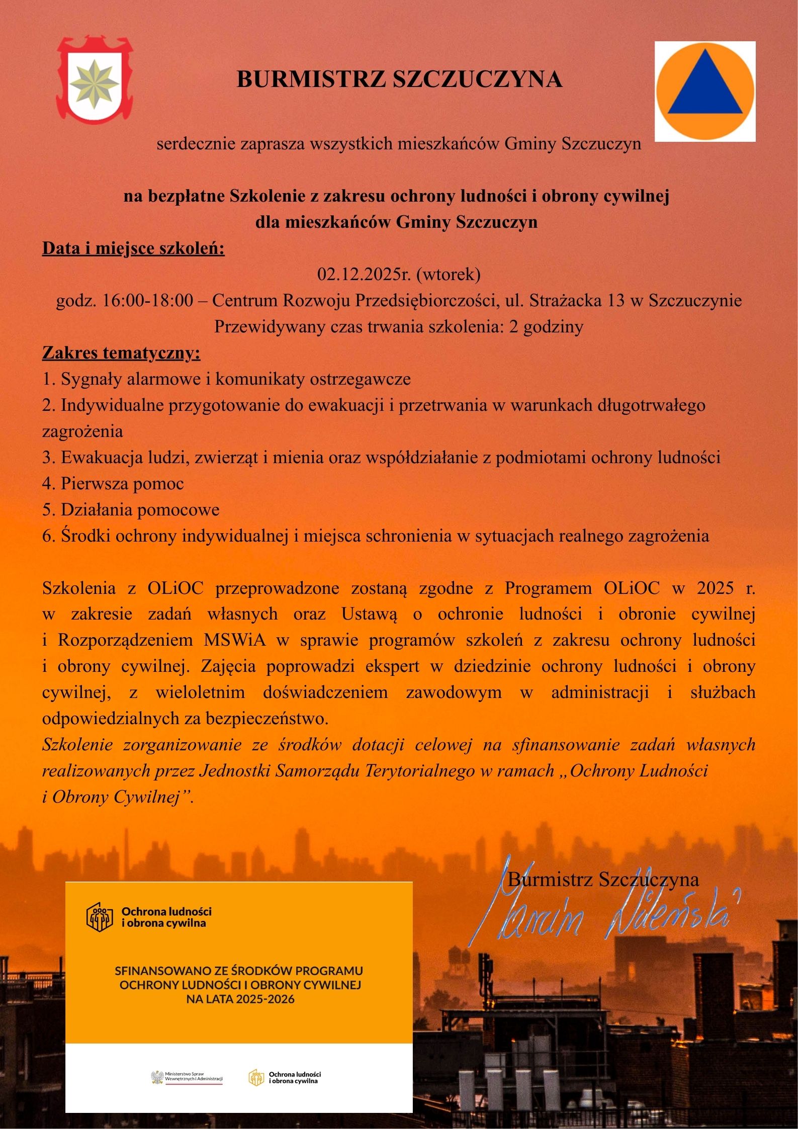Zmiana terminu Szkolenia z zakresu ochrony ludności i obrony cywilnej dla mieszkańców Gminy Szczuczyn ❗❗❗